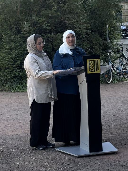 In ihren Beiträgen gedachten die Redner*innen der im ägyptischen Alexandria geborenen Frau, die seit 2005 in Dresden lebte und in dieser Stadt auf so tragische Weise den Tod fand. Aber sie wiesen auch darauf hin, dass in dieser Stadt Rassismus nach wie vor ein Problem ist. So berichteten Fatema Rezai und Mai Khalil, zwei Frauen aus dem Frauentreff des Ausländerrats Dresden e. V. über ihre persönlichen Erfahrungen mit antimuslimischem Rassismus in Dresden. Auch der Erste Bürgermeister Jan Donhauser, der in Vertretung des OB Hilbert sprach, Dr. Husein Jinah als Vertreter des Initiativkreises Gedenken.Erinnern.Mahnen und Natalija Bock vom Integrations- und Ausländerbeirat Dresden gingen in ihren Reden darauf ein, dass weiterhin mehr Engagement gegen Rassismus nötig ist. Flaurita Maffokang, seit 2023 Marwa-El-Sherbini-Stipendiatin, führte durch die Veranstaltung, die mit dem Niederlegen von Blumen und Kränzen endete.