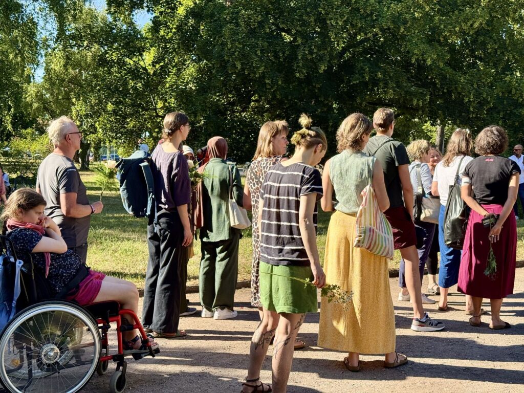 Bei über 30°C im Schatten fanden sich am 1. Juli 2025 ca. 40 Menschen im Park vor dem Landgericht Dresden ein, um an den Mord an Marwa El-Sherbini in jenem Gebäude vor 16 Jahren zu erinnern. Viele hielten Fotografien in den Händen, mit denen die Künstlerin Susanne Keichel seit 2010 die jährlichen Gedenkveranstaltungen dokumentiert. Zu der Veranstaltung im Park, der seit 2022 den Namen von Marwa El-Sherbini trägt, hatte der Initiativkreis Gedenken.Erinnern.Mahnen eingeladen.