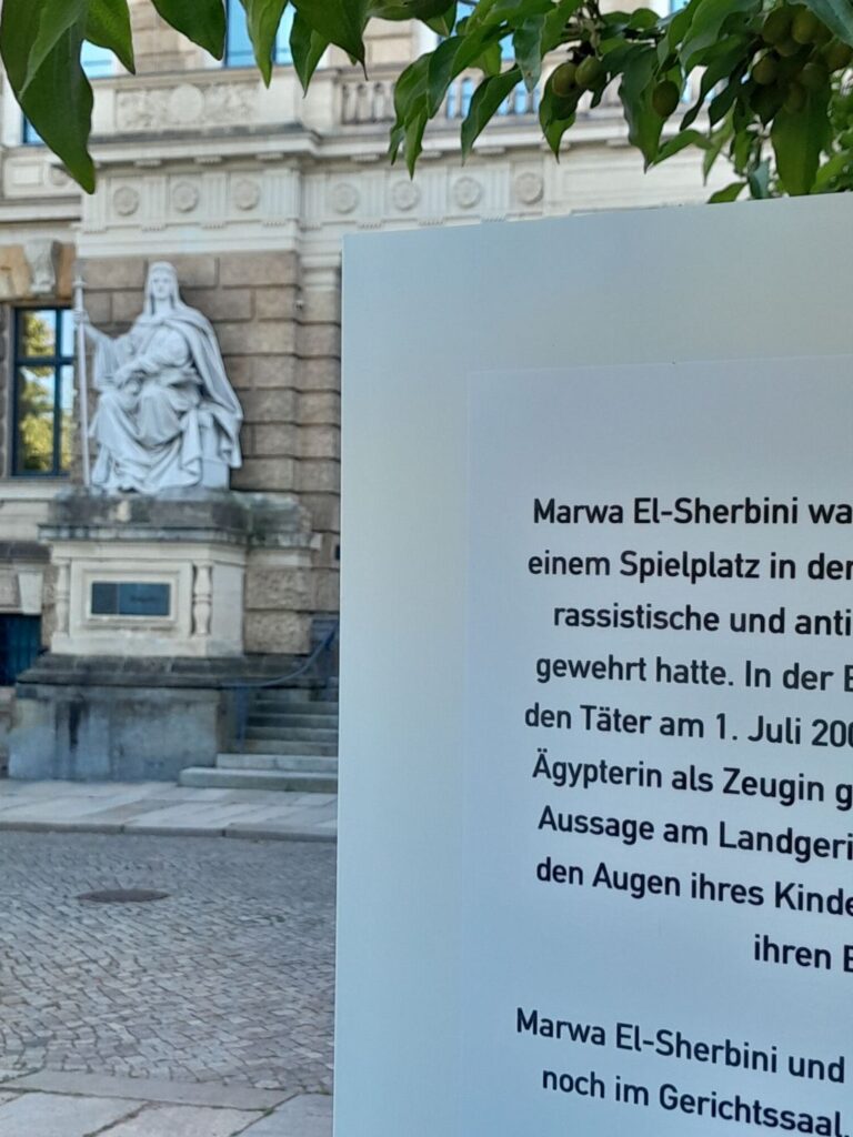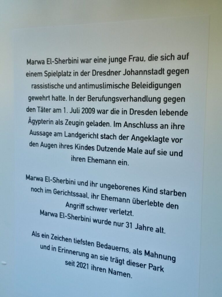 Ärgerlich ist, dass im Marwa El-Sherbini-Park bis heute noch keine Gedenktafel an das tragische Ereignis erinnert, obwohl ein entsprechender Beschluss bereits im November 2021 vom Dresdner Stadtrat gefasst wurde. In den letzten Jahren setzte sich der Initiativkreis Gedenken.Erinnern.Mahnen aktiv für die Umsetzung des Beschlusses ein und entwarf in einem Beteiligungsprozess gemeinsam mit dem Kulturamt der Stadt einen Text. Zudem wurden Entwürfe für die gestalterische Umsetzung einer Gedenkstele eingeholt. Obwohl der ausgewählte Gestaltungsentwurf und der auch mit dem Witwer abgestimmte Text im Mai 2022 vom Kulturausschuss beschlossen wurde, verzögerte sich die Errichtung der Stele weiter. Nachdem die Aufstellung auch im Juli 2024 aus Anlass des 15. Todestages nicht erfolgte, kam es in diesem Jahr wieder nicht dazu. Diesmal bremst das Sächsische Staatsministerium der Justiz. Dieses 2024 noch von Frau Meier (BÜNDNIS 90/DIE GRÜNEN) geführte Ministerium beteiligte sich an der Finanzierung der Stele, strebt aber nach der 2025 erfolgten Neubesetzung eine Änderung des vom Kulturausschuss beschlossenen Textes an.